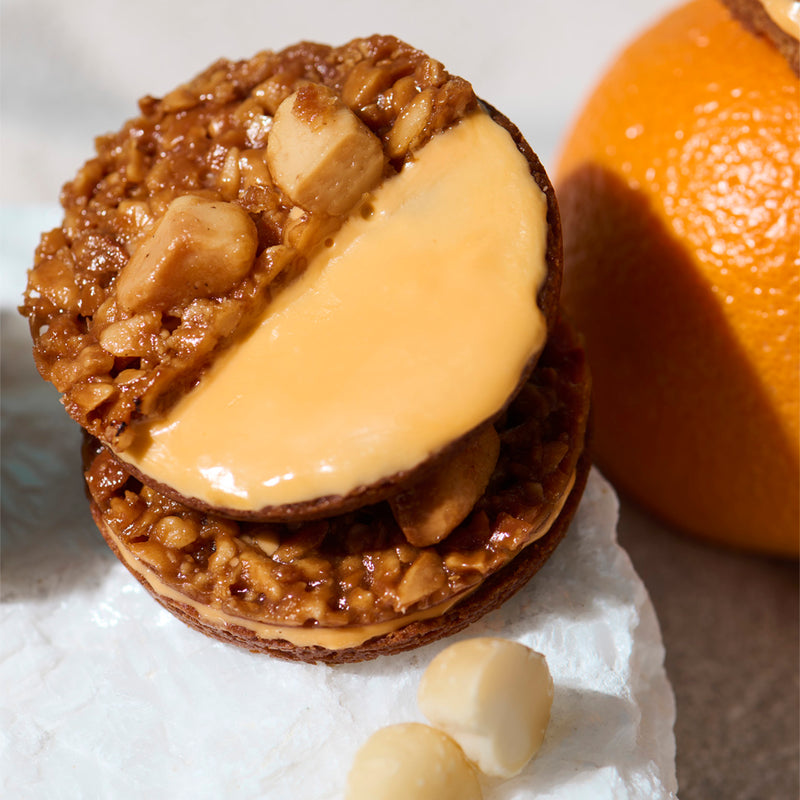 “ナッツの王様”マカダミアナッツの形が異なる2種を使った甘く香ばしいザクザク食感のチュイールに、オレンジがほんのり香るチョコレートコーチングとザクホロオレンジクッキーを重ね合わせました。